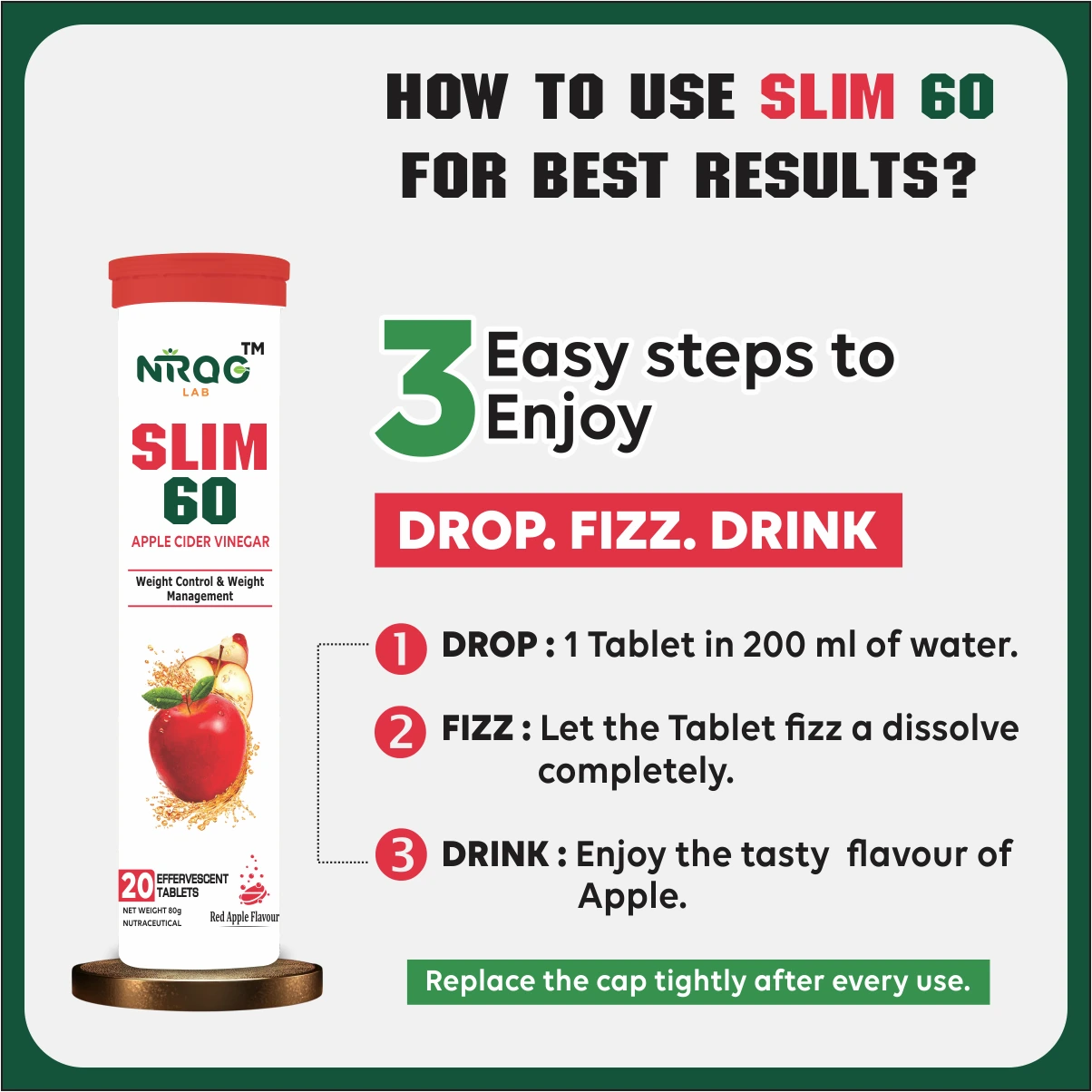 The best way to consume Nirog Lab Slim 60 ACV Tablets is to consume each tablet daily 30 minutes before lunch and dinner in 200ml cold water. Nirog Lab Slim 60 highly recommend to include a healthy diet and physical activity for the desired results.
